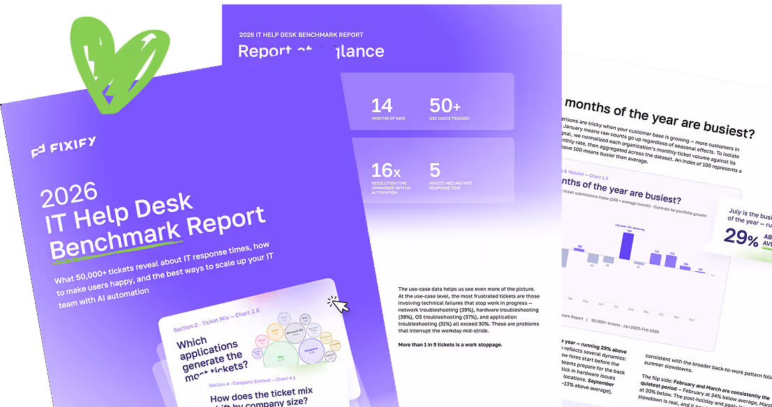 Fixify's 2026 IT Help Desk Benchmark Report changes that. We analyzed 50,000+ real help desk tickets across multiple organizations over fourteen months — ticket timing, categories, sentiment, response times, resolution speeds — so you can finally see how your team stacks up and where the biggest opportunities are.